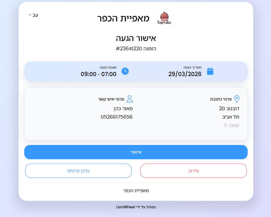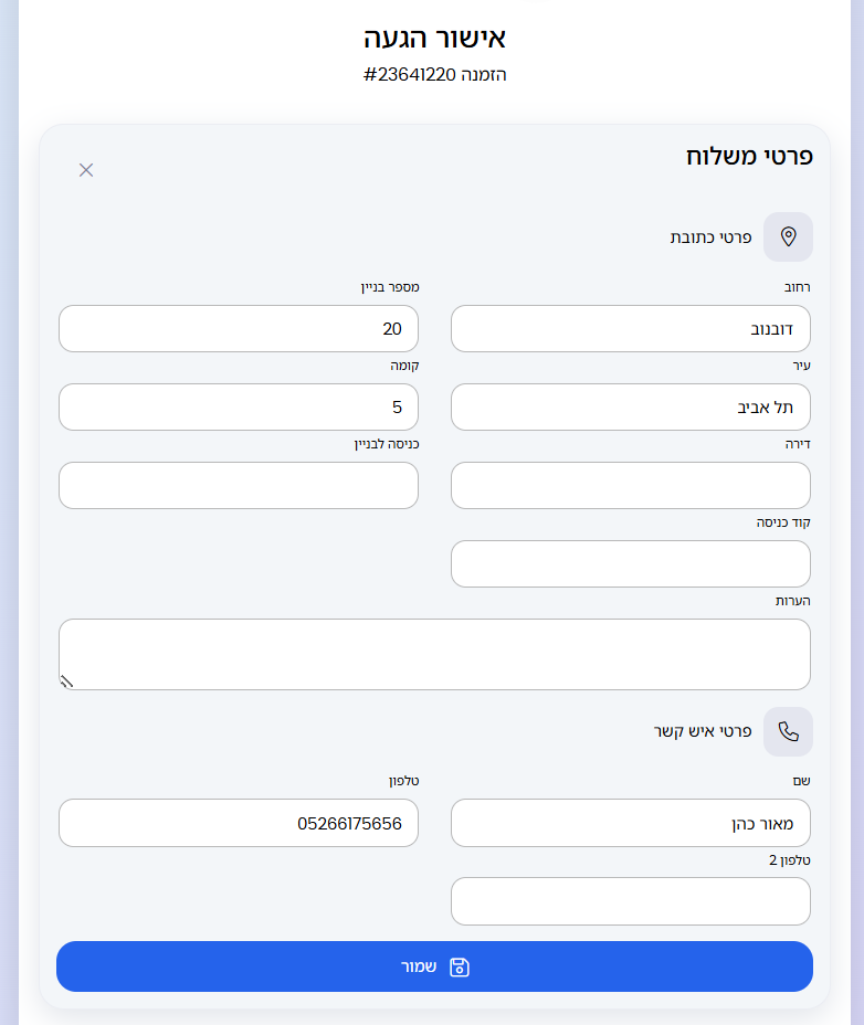 *אם עודכן שדה שאינו דורש תיאום מחדש, הפרטים נשמרים והלקוח יכול לאשר את המשלוח בהתאם לעדכון שביצע