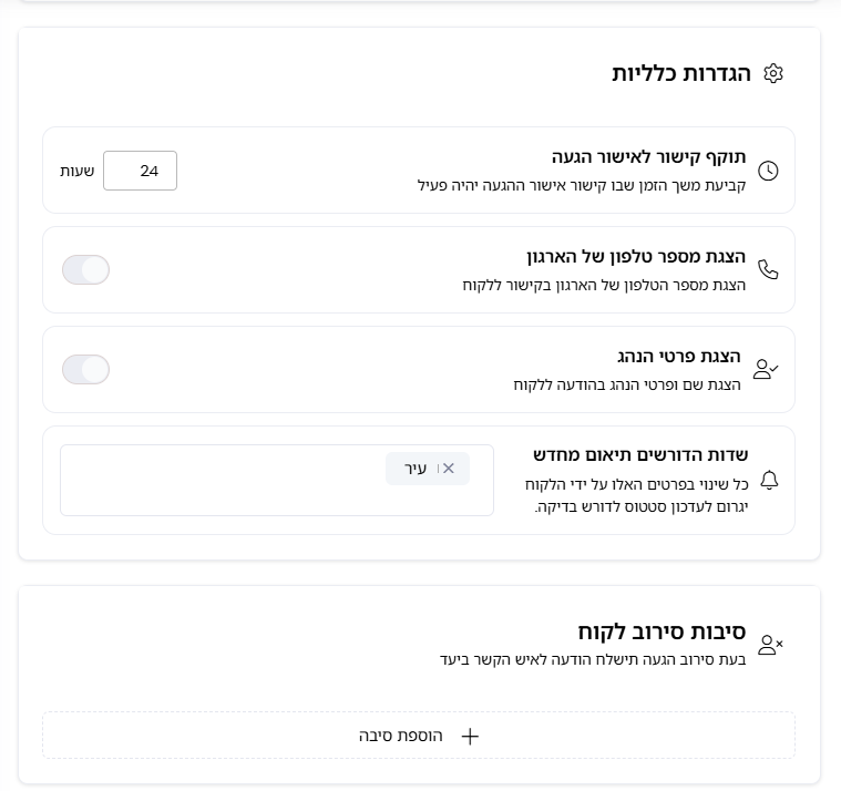 בחלק השני, ניתן להגדיר את תוקף הקישור (בשעות), איזה מידע להציג בקישור, את השדות הדורשים תיאום מחדש ואת סיבות הסירוב.