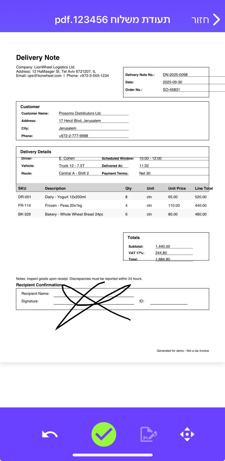 1. הנהג פותח את המסמך מתוך האפליקציה ונכנס למצב עריכה.